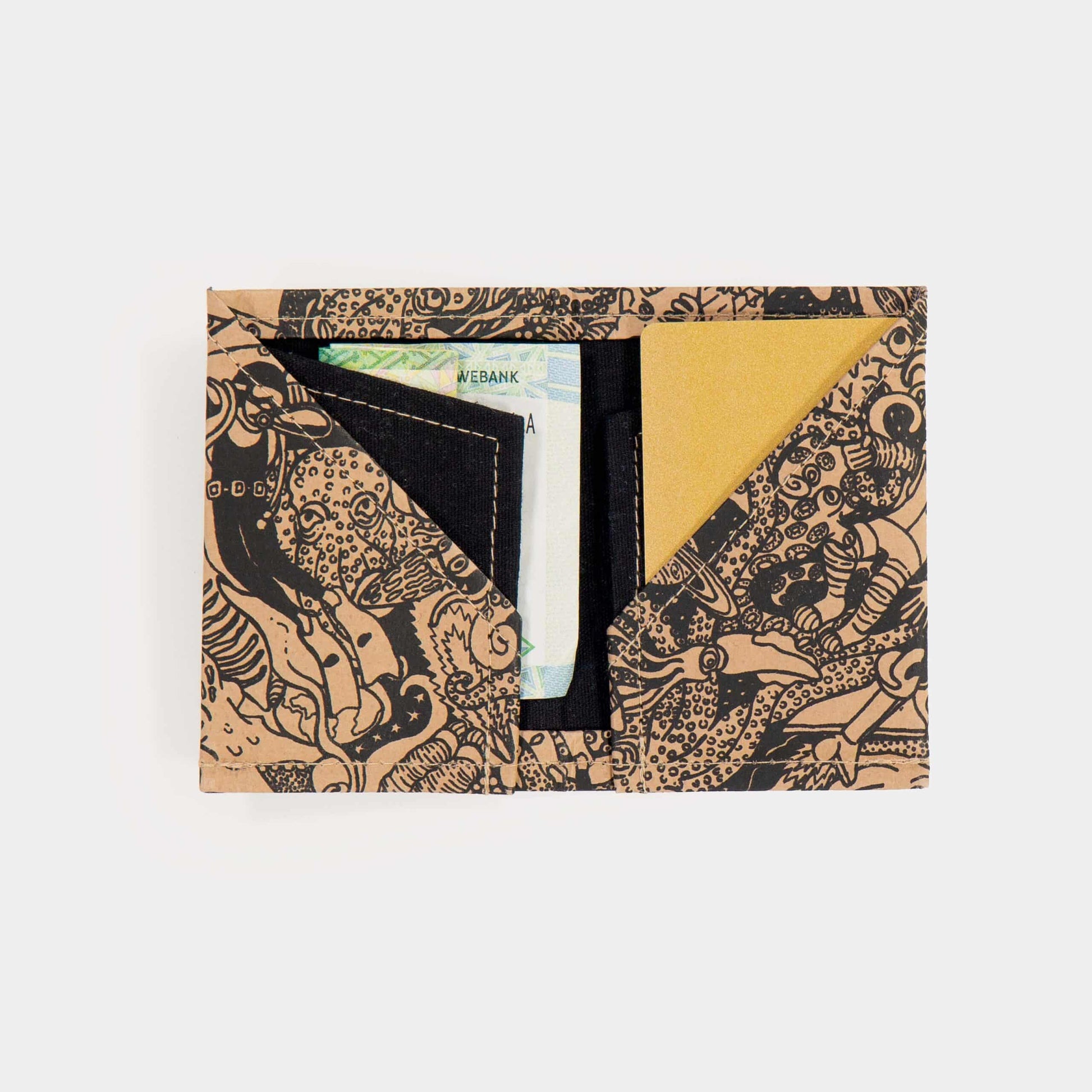 Each piece in the “Between Here and There” collection is a canvas for these unique artworks, screen-printed or digitally printed onto Wren’s signature products. From sustainable paper wallets to versatile laptop sleeves, these accessories bring art into your daily life.