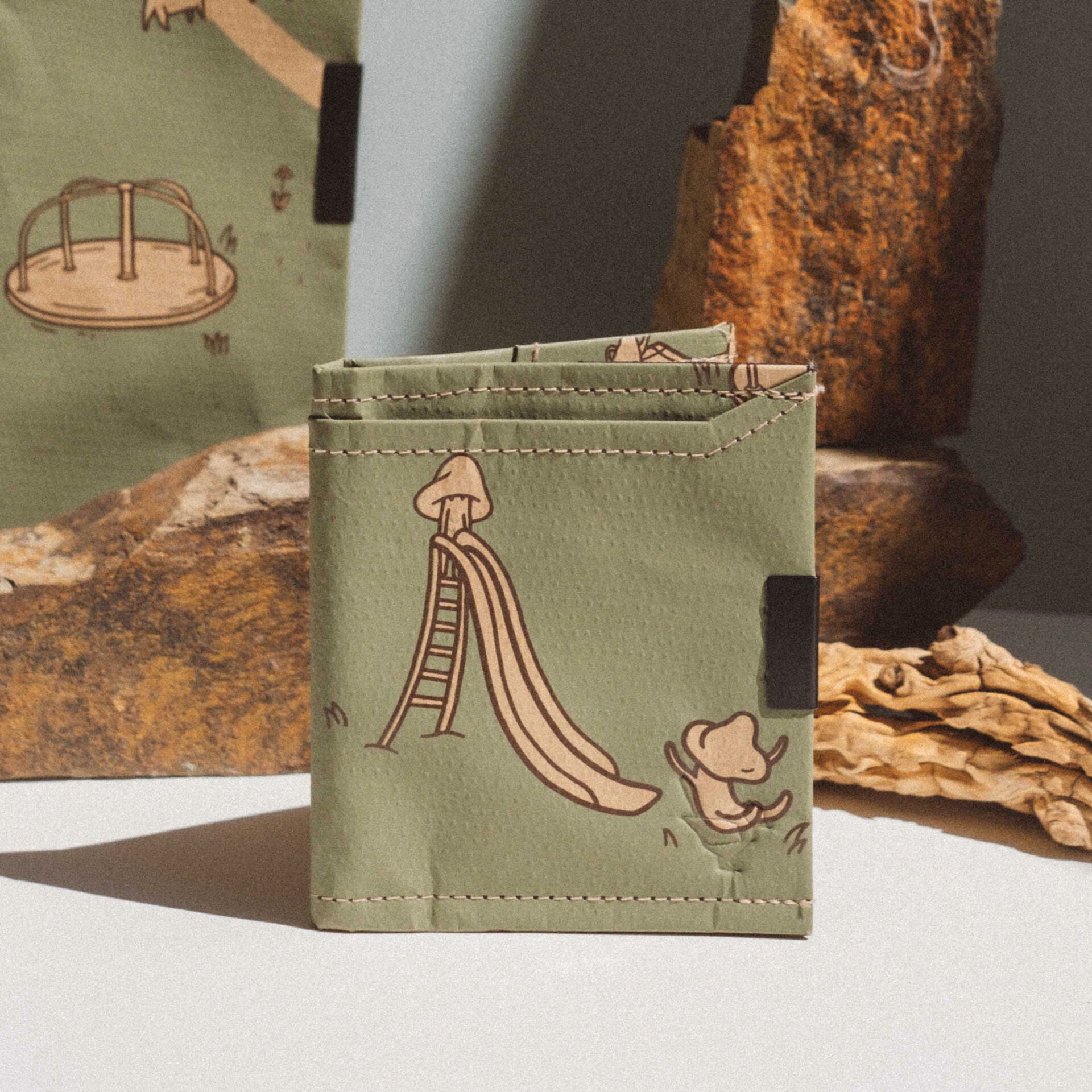 Each piece in the “Between Here and There” collection is a canvas for these unique artworks, screen-printed or digitally printed onto Wren’s signature products. From sustainable paper wallets to versatile laptop sleeves, these accessories bring art into your daily life.