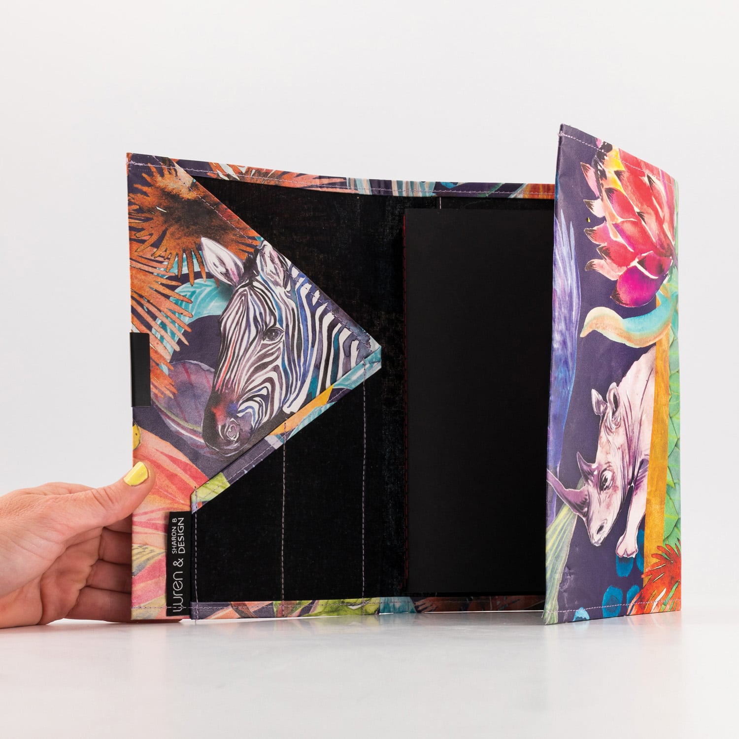 Made with ProtectPaper® (reclaimed and reinforced paper fused to cotton). Padded and lined interior for device protection. Front pocket for cables, pens, or notes.